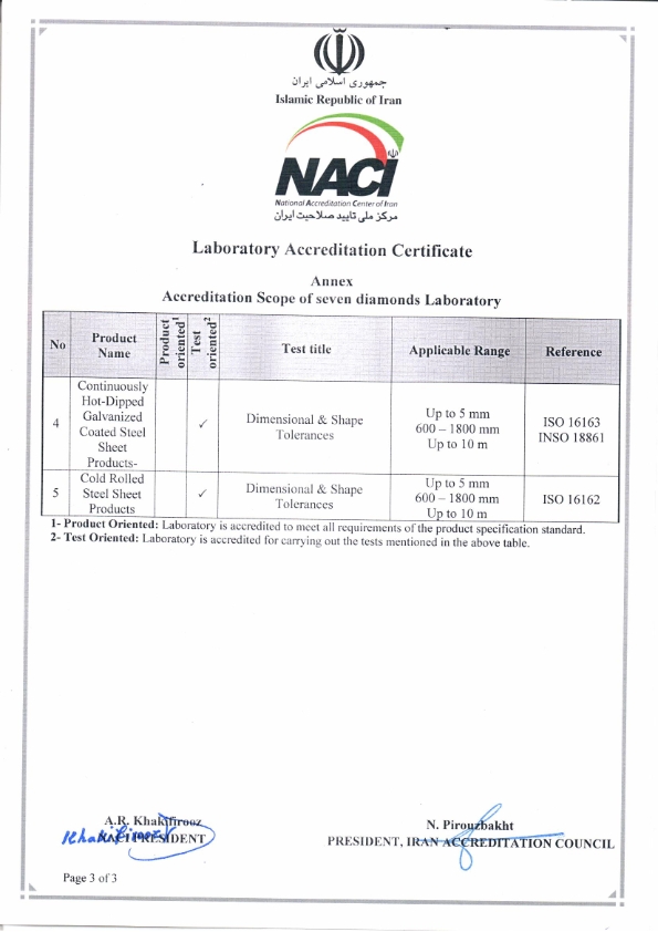 با هدف توليد انواع ورق گالوانيزه، نورد سرد، استنلس استيل (فولاد زنگ نزن) و ساير مقاطع فولادی در سال ١٣٧٥ تاسيس گرديد. عمليات عمرانی اين شركت در سال ١٣٨٠ آغاز و در سال ١٣٨٢ با ظرفيت اسمی سالانه ١٠٠٠٠٠ تن ورق گالوانيزه با ضخامت ٣/٠ تا ٢ ميليمتر و عرض ١٠٠٠ و ١٢٥٠ ميليمتر به بهره برداری رسيد. توليدات ورق گالوانيزه اين شركت پاسخگوی ١٥ درصد نياز بازار داخلی بوده و حدود ٢٠ تا ٤٠ درصد از كل ظرفيت توليد نيز در بازارهای جهانی عرضه میگردد. اين شركت ضمن دريافت لوح تقدير از سوی وزير محترم صنايع و معادن به عنوان واحد نمونه صنعتی، دومين توليدكننده ورق گالوانيزه در كشور است كه علاوه بر ايجاد اشتغال در منطقه سهم بسزايی جهت تحقق خود كفايی توسعه صنعتی و رشد اقتصادی كشور دارا میباشد. دريافت نشان استاندارد ملی و گواهی كيفيت ISO ٩٠٠١:٢٠٠٨ در توليد ورقهای گالوانيزه حاكی از عزم راسخ اين شركت در تحول و دسترسی به كيفيت برتر بوده و در ادامه اين شركت در راستای اخذ گواهینامه های معتبر بين المللی از جمله ISO ١٨٠٠٠ و ISO ١٤٠٠٠ و EFQM گام بر میدارد. هم اكنون آزمايشگاههای مجهز شركت صنايع هفت الماس با اخذ گواهينامه تائيد موسسه استاندارد و تحقيقات صنعتی ايران توانایی ارائه خدمات آزمايشگاهی جهت انجام آزمونهای مختلف بر روی انواع ورق و مقاطع فولادی، گالوانيزه به روش گرم پيوسته و … را دارا میباشد. فاز اول خط تولید نورد سرد در تیرماه ١٣٨٧ به بهره برداری رسیده و با ظرفیت اسمی ٨٠٠.٠٠٠ تن در سال، ورق نورد سرد تولید مینماید. تولیدات این کارخانه ضمن تامین ورق برای خط تولید گالوانیزه هفت الماس بخشهایی از بازار مصرف داخلی و صادرات بین امللی را نیز تامین میکند.